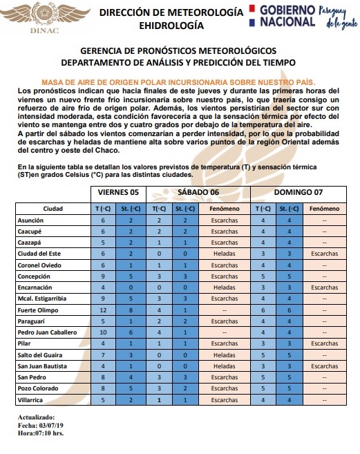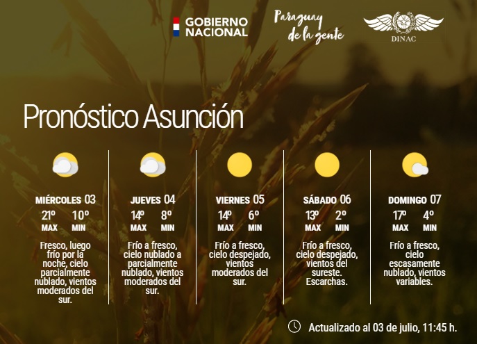 Este miércoles, la Dirección de Meteorología emitió un boletín de alerta en el que preven la llegada de un frente frío con heladas y escarchas para la madrugada de este sábado y domingo en varios puntos del país.