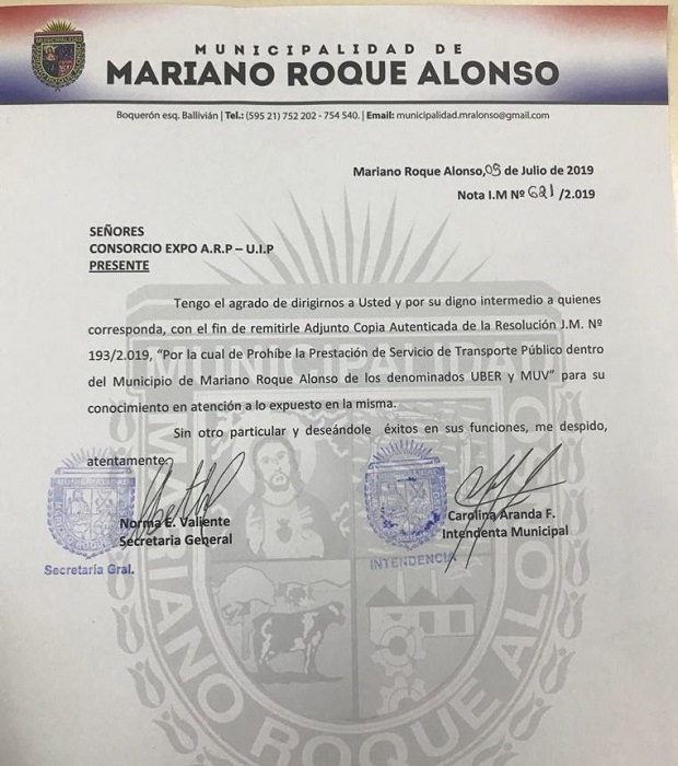 La intendenta Carolina Aranda envió una nota a los organizadores de la Expo 2019 asegurando que tanto MUV como Uber no pueden prestar servicios de transporte en Mariano Roque Alonso.