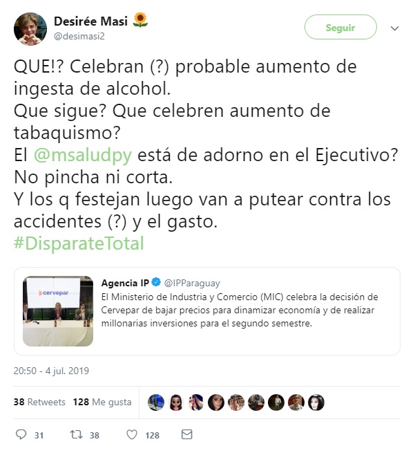 “QUE!? Celebran (?) probable aumento de ingesta de alcohol. Que sigue? Que celebren aumento de tabaquismo? El @msaludpy está de adorno en el Ejecutivo? No pincha ni corta. Y los q festejan luego van a putear contra los accidentes (?) y el gasto. #DisparateTotal”, tuiteó Masi demostrando su disgusto.
