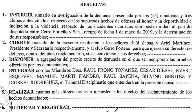 Unos 53 clubes afiliados a la Asociación Paraguaya de Fútbol (APF) denunciaron a Cerro Porteño, aparentemente, por los desmanes que se registraron una vez acabado el partido entre el Ciclón y el Sportivo San Lorenzo, por la Fecha 19 del Apertura.