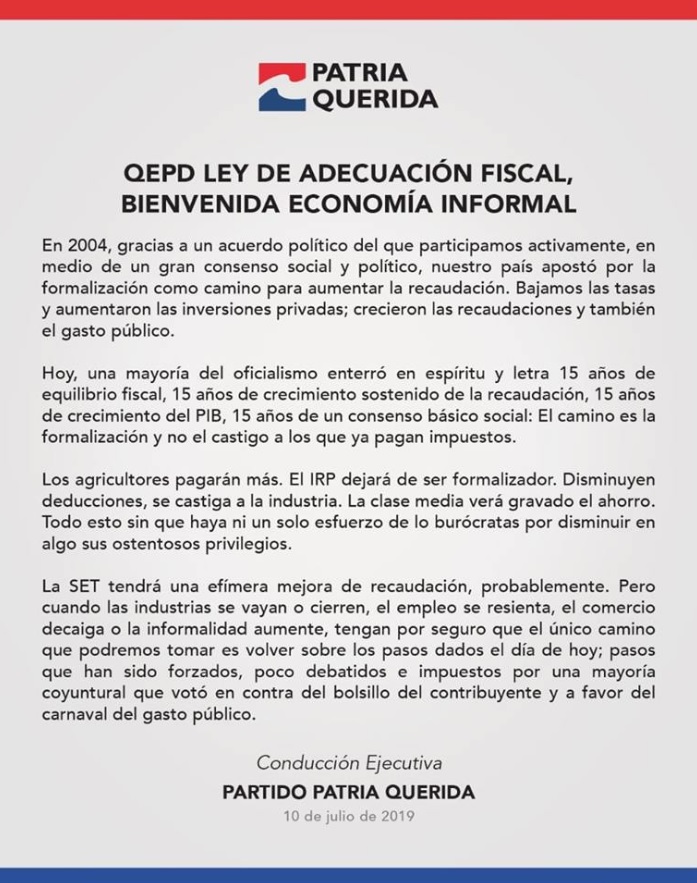 “Los agricultores pagarán más. El IRP dejará de ser formalizador. Disminuyen deducciones, se castiga a la industria. La clase media verá gravado en ahorro. Todo esto sin que haya ni un solo esfuerzo de lo (sic) burócratas por disminuir en algo sus ostentosos privilegios”, cuestiona en una de sus partes más duras.