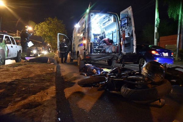 El hombre que iba al mando de la motocicleta y la mujer que lo acompañaba terminaron dentro del vehículo de emergencias y el paramédico habría resultado con al menos una pierna fracturada, pese a sus esfuerzos para esquivar al motociclista, que lo sorprendió con un raudo avance.