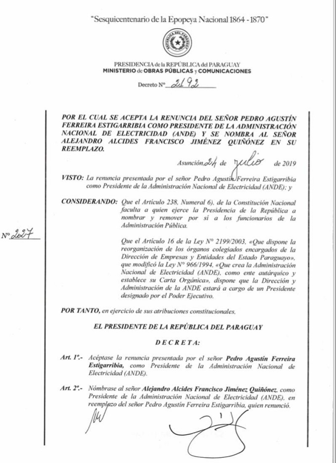 Ferreira dimitió este miércoles, según se supo, por una venta de energía al Brasil. En el acuerdo él supuestamente no fue consultado y no estaba conforme.