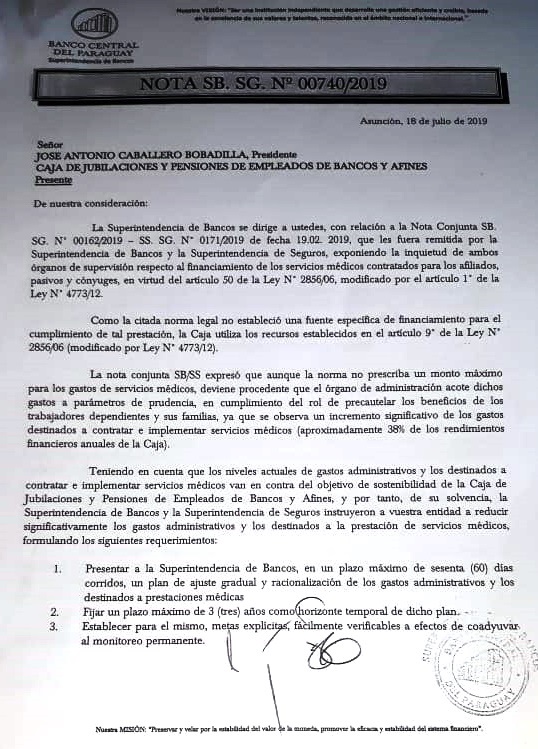 Ante una primera respuesta evasiva a requerimientos formulados por la Superintendencia de Bancos y la Superintendencia de Seguros, dependencias del BCP, la Banca Matriz indicó que los niveles de gastos administrativos y los destinados a contratar e implementar servicios médicos van en contra del objetivo de sostenibilidad y la solvencia de la Caja Bancaria.