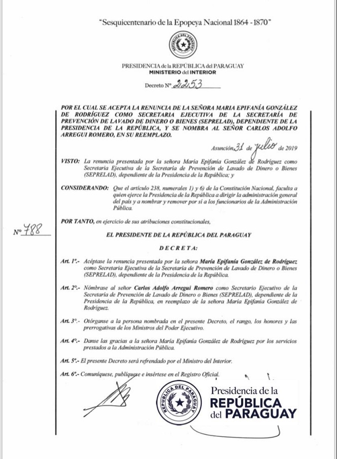 Mediante el decreto 2253, Abdo Benítez nombró a Arregui como nuevo ministro de la Seprelad.