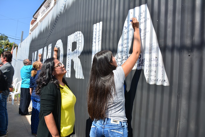 Familiares y sobrevivientes de las víctimas dejaron sus mensajes sobre el grafiti pintado en el vallado, donde se está construyendo el Sitio de Memoria y Centro Cultural 1A Ycuá Bolaños.