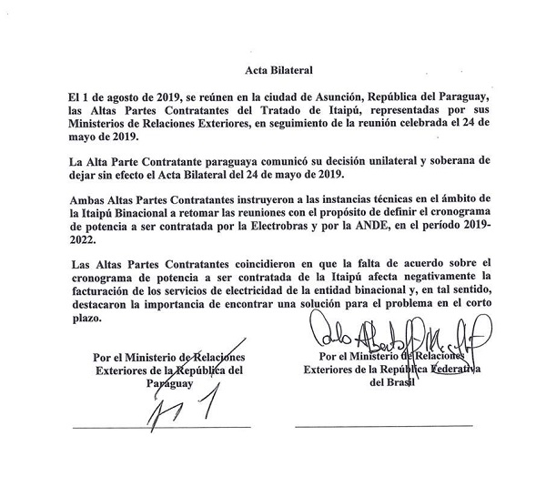 Autoridades de la Cancillería Paraguaya y Brasileña anunciaron mediante conferencia de prensa que se deja sin efecto el acta bilateral del 24 de mayo del 2019.