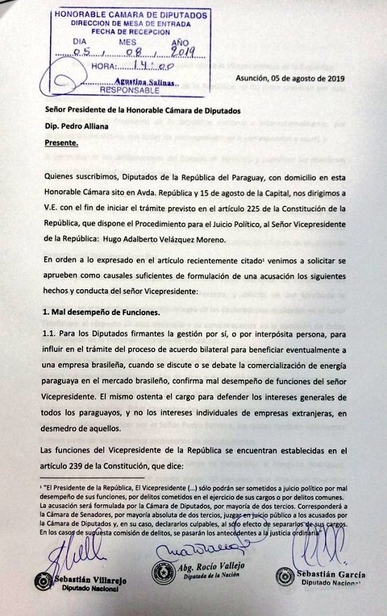 De acuerdo a los informes, con el libelo acusatorio pretenden dar inicio al proceso de juicio político contra el vicepresidente.