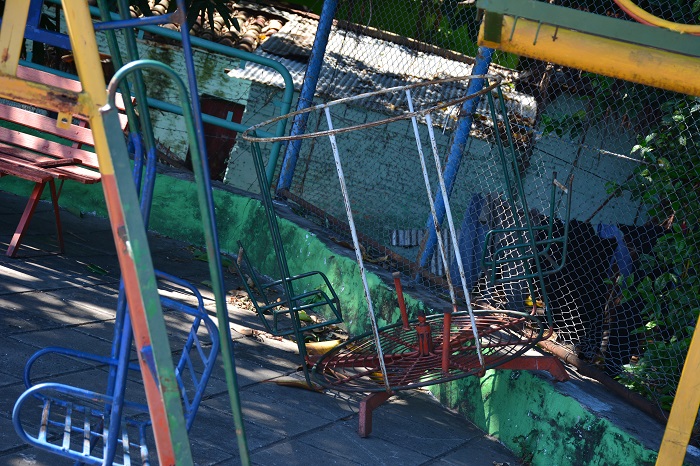 La grieta afecta también una de las viviendas de la zona. Foto: Mirtha Ozuna.Los lugares de ocio, como bancos, calesitas, entre otras infraestructuras se encuentran en pésimo estado. El paso del tiempo, y los cambios climáticos, sumados a la falta de interés de las autoridades son solo algunos de los causantes.