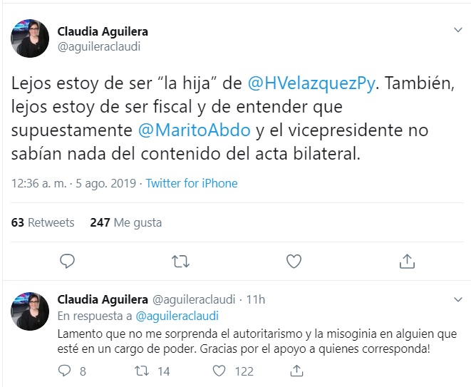 Ella no se quedó atrás y en su cuenta de Twitter manifestó: “Lejos estoy de ser “la hija” de @HVelazquezPy. También, lejos estoy de ser fiscal y de entender que supuestamente @MaritoAbdo y el vicepresidente no sabían nada del contenido del acta bilateral”.