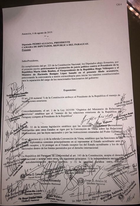 De acuerdo a lo que manifestó Celso Kennedy del PLRA, 29 diputados liberales, dos del Encuentro Nacional y Carlos Rejala, del partido Hagamos firmaron el pedido de juicio político contra el presidente Mario Abdo Benítez, el segundo al mando Hugo Velázquez y el ministro de Hacienda, Benigno López.