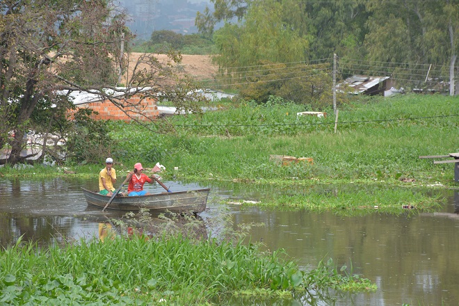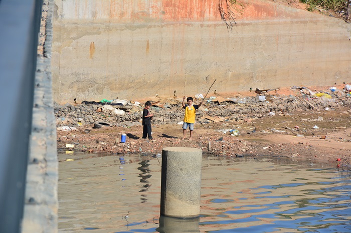 Debajo del puente en la desembocadura del arroyo Mburicao, al río Paraguay los niños aprovechan para jugar o pescar.
