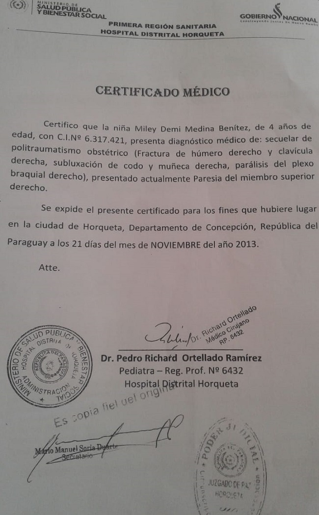 Miley Demi Medina Benítez, hija de Vivian, presentó fractura de húmero derecho y clavícula derecha, subluxación de codo y muñeca derecha y paralasis del plexo braquial derecho.