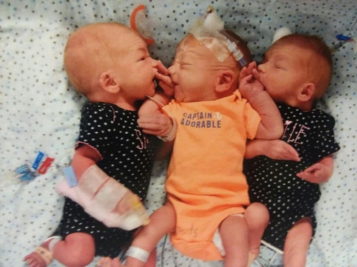 Los trillizos Blaze, Gypsy y Nikki nacieron con una diferencia de cuatro minutos y pesaron 1,800 kilos. Una amiga de la mujer ya creó una página de recaudación de fondos para ayudar a los padres a afrontar los gastos de esta inesperada llegada.