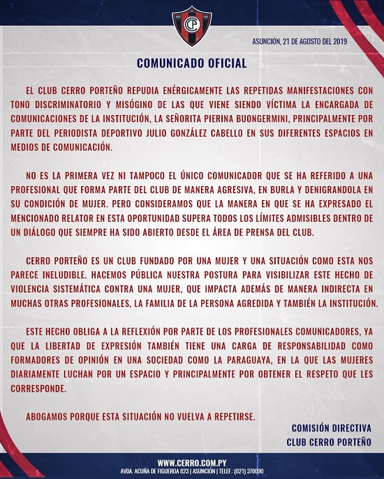 “El club Cerro Porteño repudia enérgicamente las repetidas manifestaciones con tono discriminatorio y discriminatorio de las que viene siendo víctima la encargada de comunicación, Pierina Bougermini, por parte del periodista deportivo, Julio González Cabello”, reza el texto.
