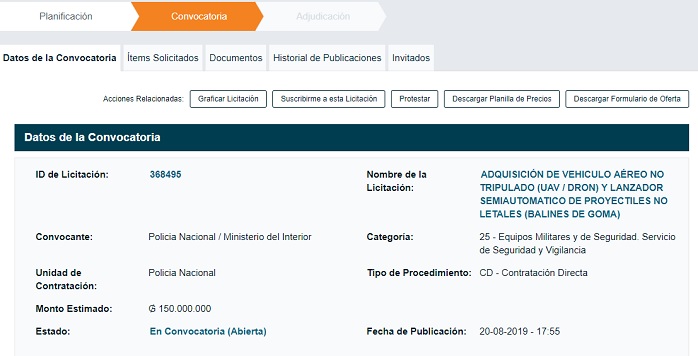 El nombre del procedimiento es “Adquisición de vehículo aéreo no tripulado (UAV/dron) y lanzador semiautomático de proyectiles no letales (balines de goma)”.