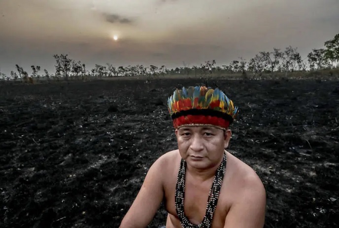 Un nativo poblador del Amazonas posa con un fondo lúgubre.