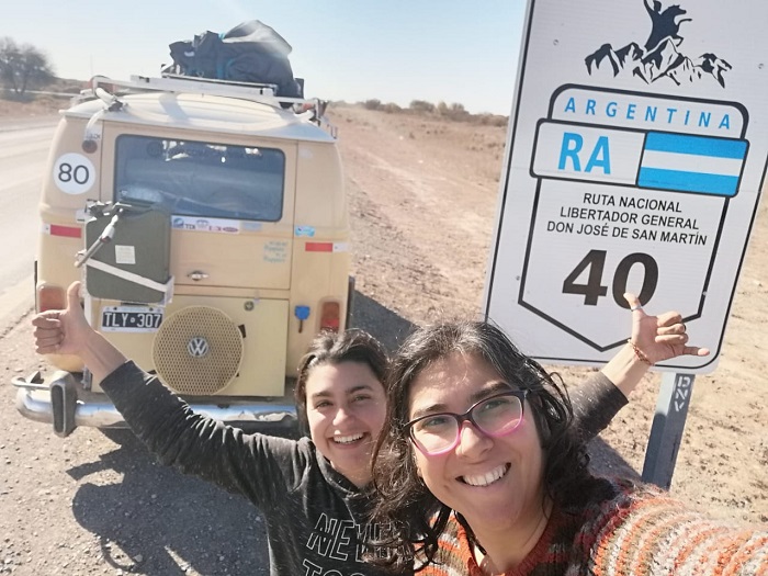 Flor Cernuschi, de 29 años, y Gise Ares, de 40 años, son de Buenos Aires y arracaron su viaje en Ushuaia, acompañadas de Duque; un doberman, Gaspar; un salchicha arlequín de 9 años y la gatita Omalley. Las chicas quieren recorrer toda Ameríca a bordo de su combi “Calimba”, hasta llegar a Alaska.