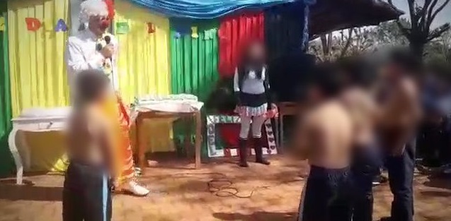 En tanto que desde que comienza la grabación se logra observar a niños con el torso al descubierto, reunidos frente al payaso.
