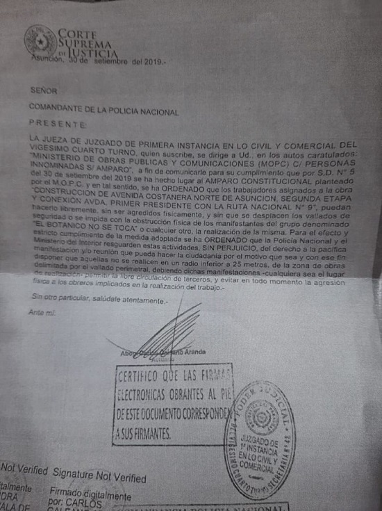 Por su parte Francisco Oviedo, asesor jurídico de la Policía Nacional que acompañó el cumplimiento de la orden, explicó que el “la Policía Nacional fue notificada de este oficio en el amparo de la causa del Ministerio de Obras Públicas y comunicaciones contra personas innominadas.