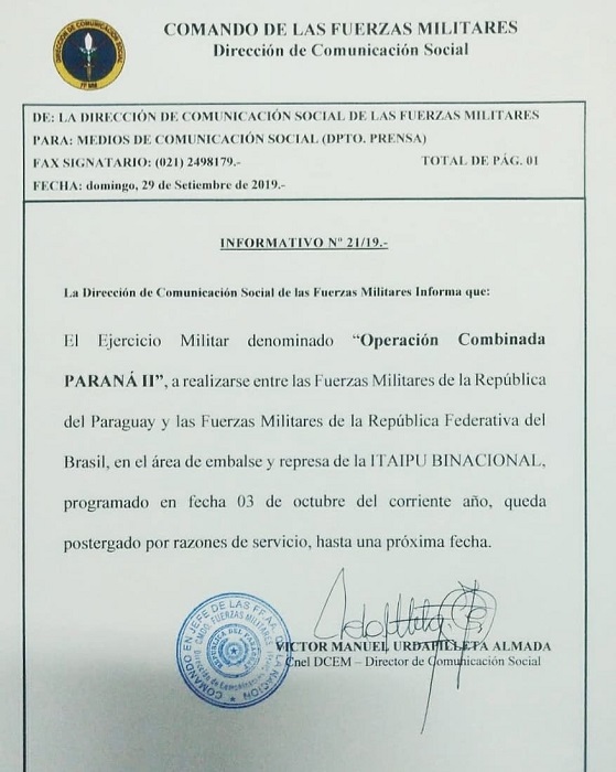 La tarea, en donde fuerzas militares de Paraguay y Brasil iban a simular una invasión a Itaipú, fue suspendida por motivos de “servicio”.  La postergación del evento fue comunicado a través de una nota firmada por el coronel Víctor Urdapilleta.