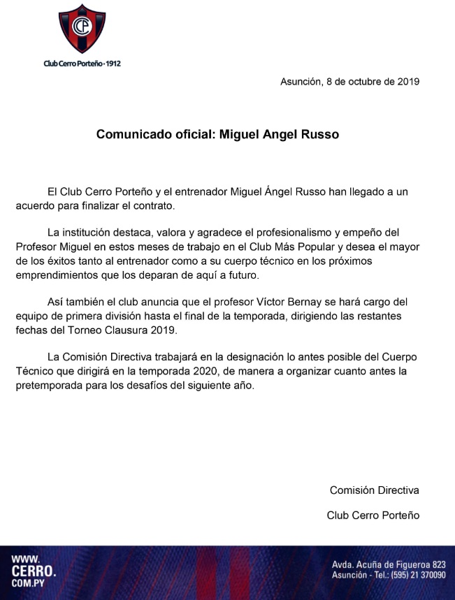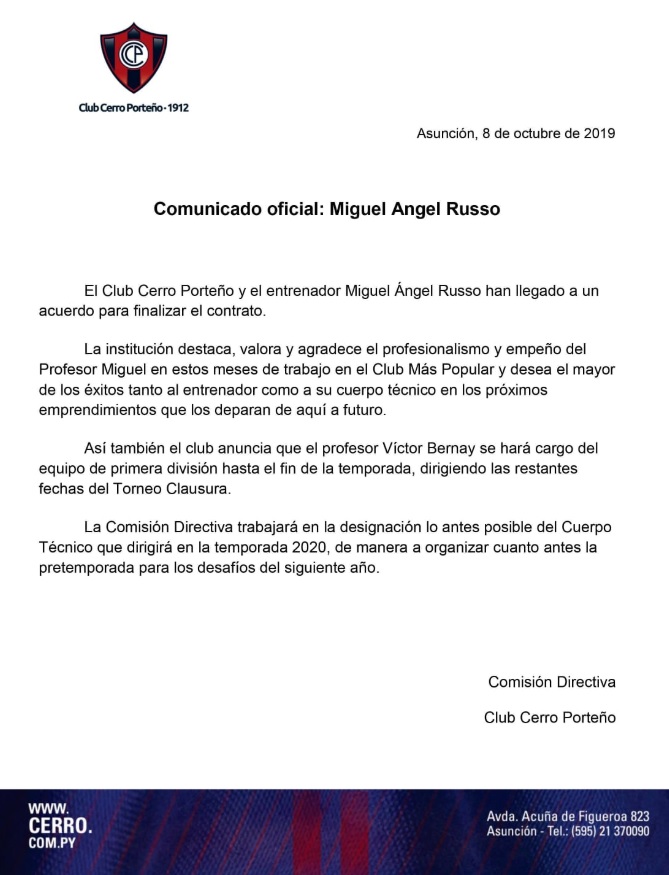 Al filo del mediodía de este martes, Cerro Porteño informó sobre la salida de Migue Ángel Russo.