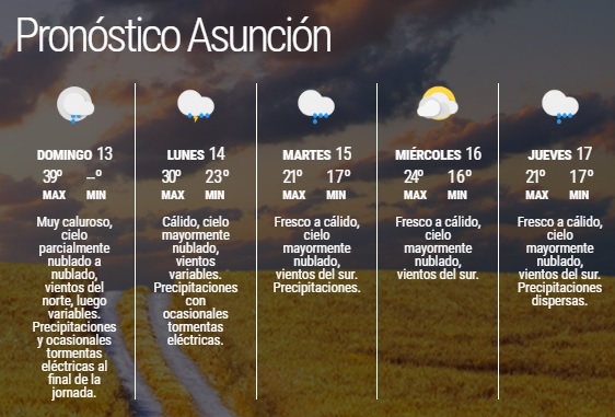 El ambiente para este domingo es muy caluroso en todo el territorio nacional con temperaturas máximas de 37°C a 41 °C.