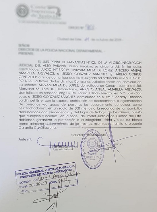 De acuerdo al documento, los manifestantes no podrán movilizarse en un radio de 300 metros del domicilio de los magistrados, Aniceto Amarilla, Miryan Meza de López e Isidro González.