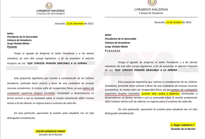 De acuerdo a una investigación realizada por el programa Algo Anda Mal (AAM), de Noticias Paraguay, en septiembre del 2012, Óscar González Daher presentó una nota al entonces presidente de la Cámara Alta, Jorge Oviedo Matto, pidiendo pensión para una mujer, que padecía de “cardiopatía isquémica (angina inestable)”, hecho que no le permitía obtener el sustento diario.