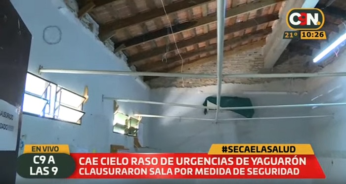 El cielo raso de la sala de urgencias del Hospital de Yaguarón se desplomó en la madrugada de este martes, el hecho ocurrió cuando en el lugar no se encontraban personas, por lo que no hubo víctimas.