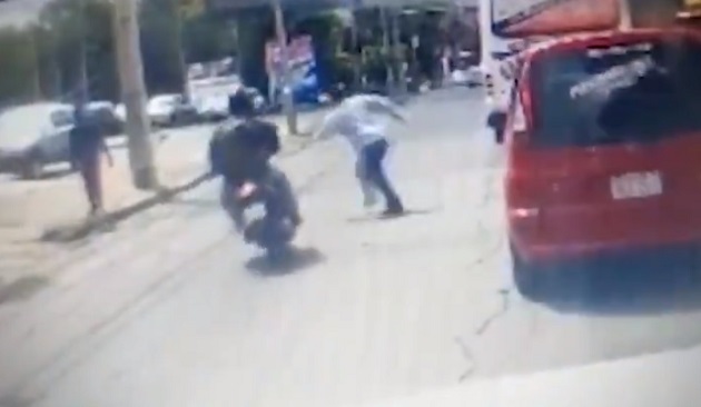 En el video se logra observar cuando un hombre cruza la transitada avenida en medio de vehículos, y de pronto aparece un motociclista que intenta adelantarse.