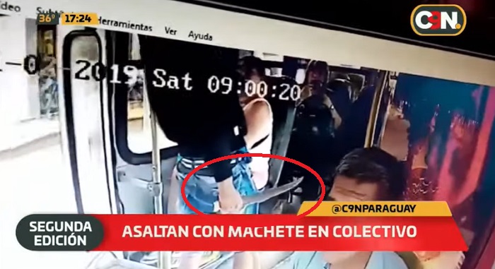 Una cámara de circuito cerrado colocado en un bus mostró el momento en que dos delincuentes abordaron el colectivo, uno de ellos con machetillo en mano, y asaltaron a los pasajeros.