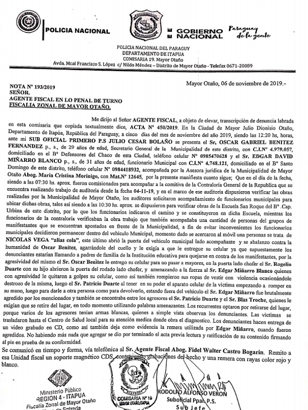 Morínigo mencionó a RDN que el pasado martes alrededor de las 10:00 dos funcionarios de la municipalidad de Mayor Otaño fueron víctimas de una turba de manifestantes.