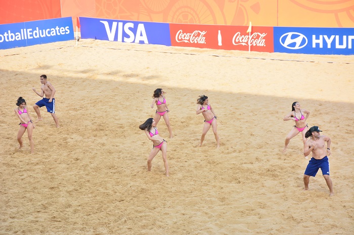 Un grupo integrado por cinco mujeres y dos hombres animaron el entretiempo con un popurrí de bailes. Mientras los jugadores se preparaban para ingresar a la cancha.