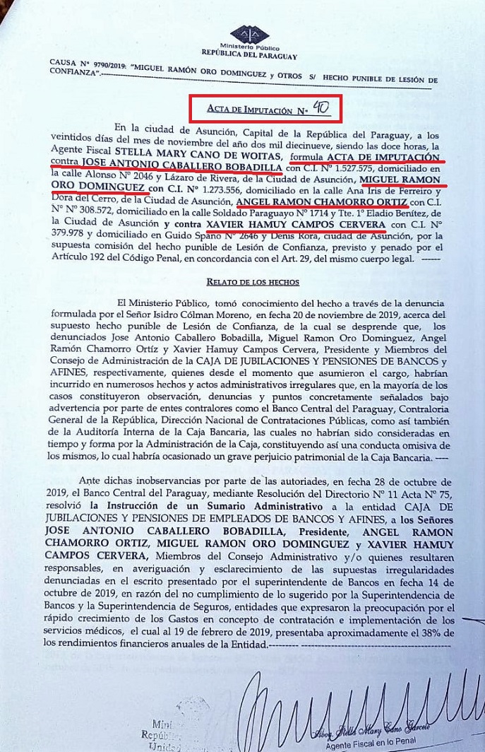 El Acta de Imputación Número 40 de fecha 22 de noviembre de 2019, emitida por la fiscala Stella Mary Cano de Woitas, formula imputación contra el presidente de la Caja Bancaria José Antonio Caballero Bobadilla y los miembros del Consejo de Administración, ellos son: Ángel Ramón Chamorro Ortiz, Miguel Ramón Oro Domínguez y Xavier Hamuy Campos Cervera. Todos soportan proceso por el hecho punible de lesión de confianza.