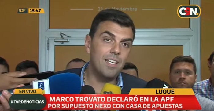 El presidente del club Olimpia, Marco Trovato, fue hasta la audiencia convocada por la Asociación Paraguaya de Fútbol, para declarar ante el Tribunal de Ética en el caso de su supuesta relación comercial con casas de apuestas deportivas.