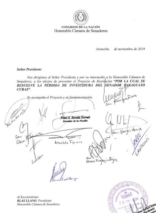 Los senadores Fidel Zavala, Enrique Riera, Oscar Salomón, Martín Arévalo, Arnaldo Franco, María Eugenia Bajac, Blas Lanzoni, Hermelinda Alvarenga, Enrique Riera, entre otros, firmaron el documento remitido a la presidencia de la Cámara Alta.