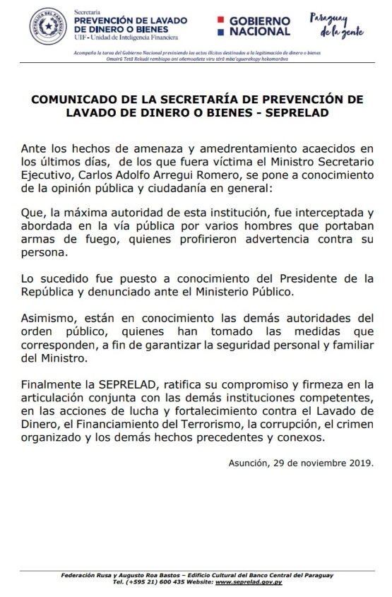 Este viernes, la Seprelad lanzó un comunicado en el cual relata lo ocurrido. “…la máxima autoridad de esta institución, fue interceptada y abordada en la vía pública por varios hombres que portaban armas de fuego, quienes profirieron advertencia sobre su persona”.