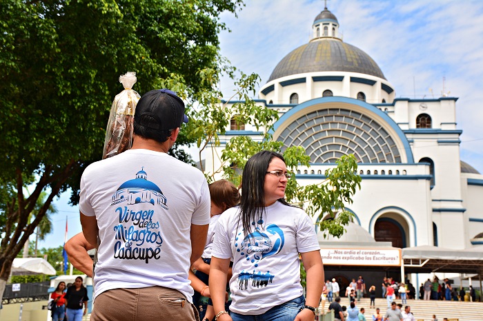 Otra imagen de la Virgen llega en brazos de un hombre a la basílica. El mismo fue acompañado de su familia.