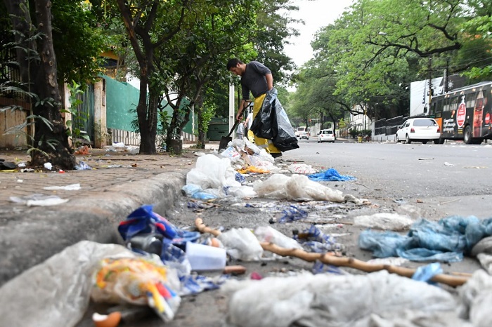 Botellas de vidrios, latitas y todo tipo de plásticos están repartidos a lo largo de la avenida Mariscal López, sobre todo frente al club Olimpia.