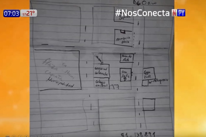 En el croquis encontrado se puede visualizar que fueron marcadas las casas del senador colorado Derlis Osorio y de su padre, además de referencias como la plaza municipal y la iglesia de dicha ciudad.