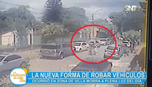 Cámaras de circuito cerrado captaron el momento y el modus operandi de dos malvivientes. Uno de ellos se encontraba en el interior de una camioneta manipulándola para ponerla en marcha.