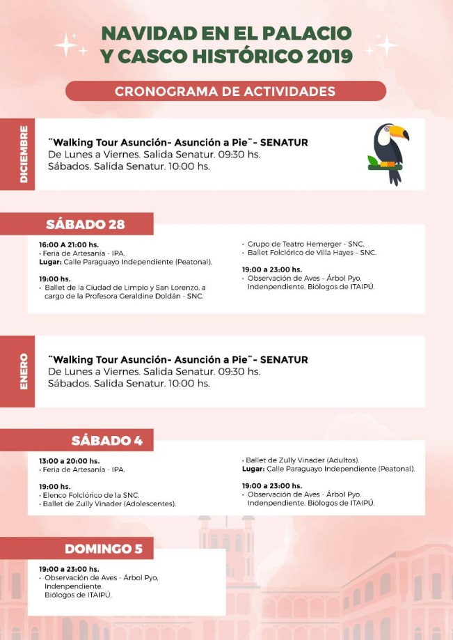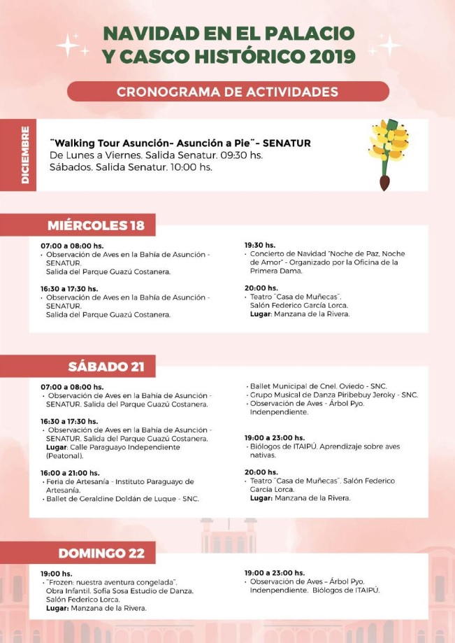 Además, los sábados a la tarde habrá espectáculos artísticos de música, danza y teatro, actividades a cargo de la Secretaría Nacional de Cultura (SNC), que cuenta con la valiosa colaboración de los elencos y artistas que participarán de las variadas actividades.