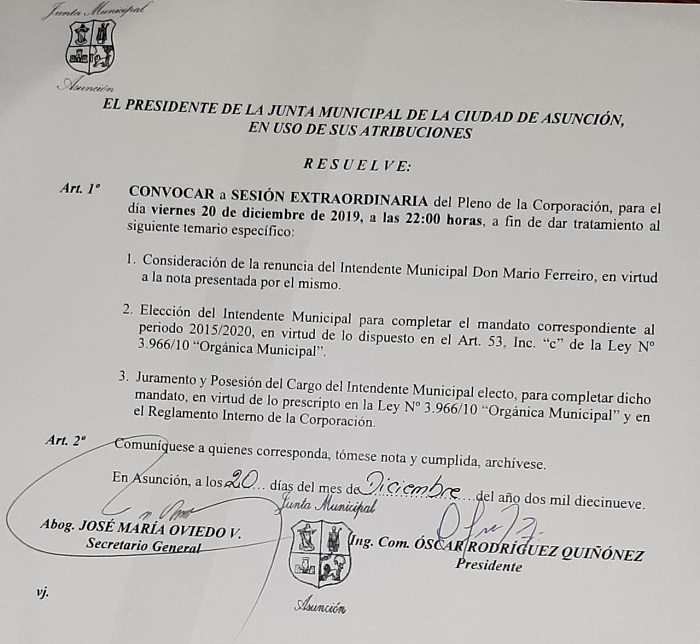 Oscar Rodríguez, presidente de Junta Municipal de Asunción convocó este viernes a una sesión extraordinaria para las 22:00.