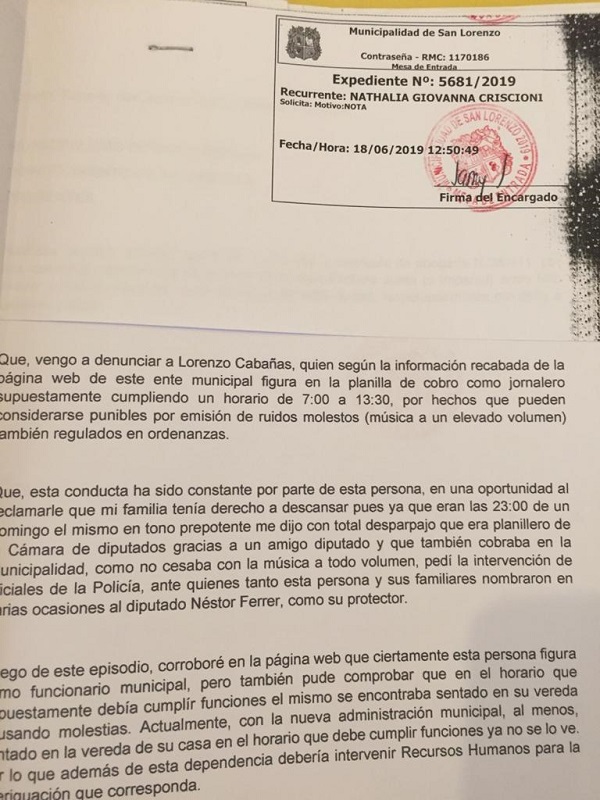 Refirió que Cabañas le aseguró que es planillero de la Municipalidad de San Lorenzo y que él puede hacer lo que quiera en su vivienda.
