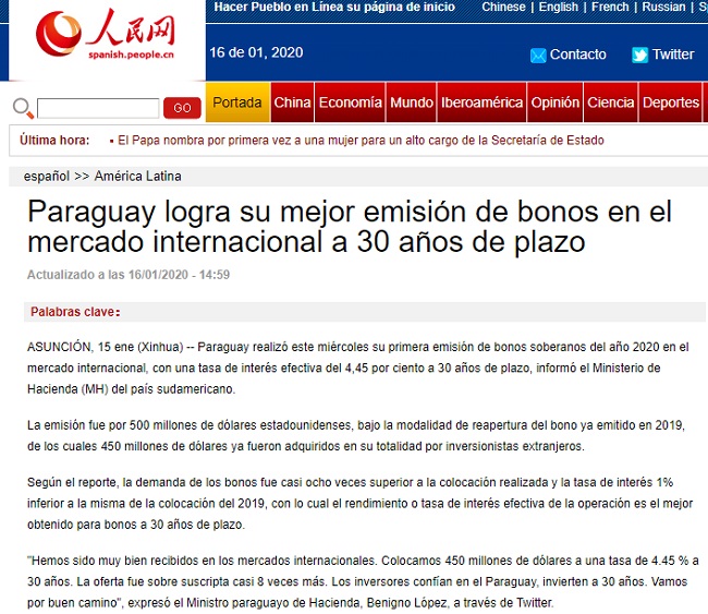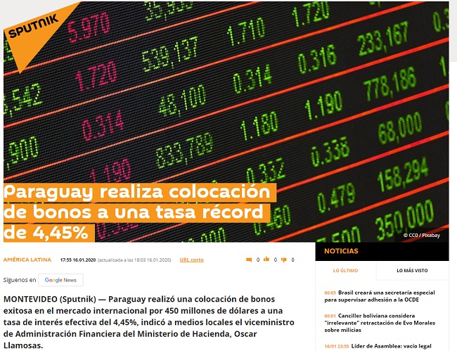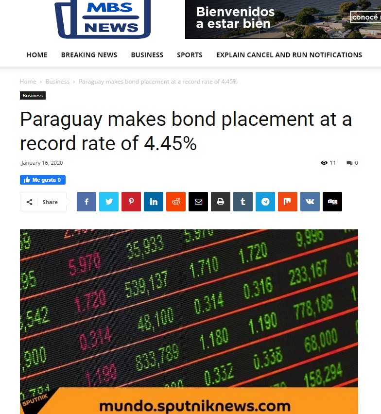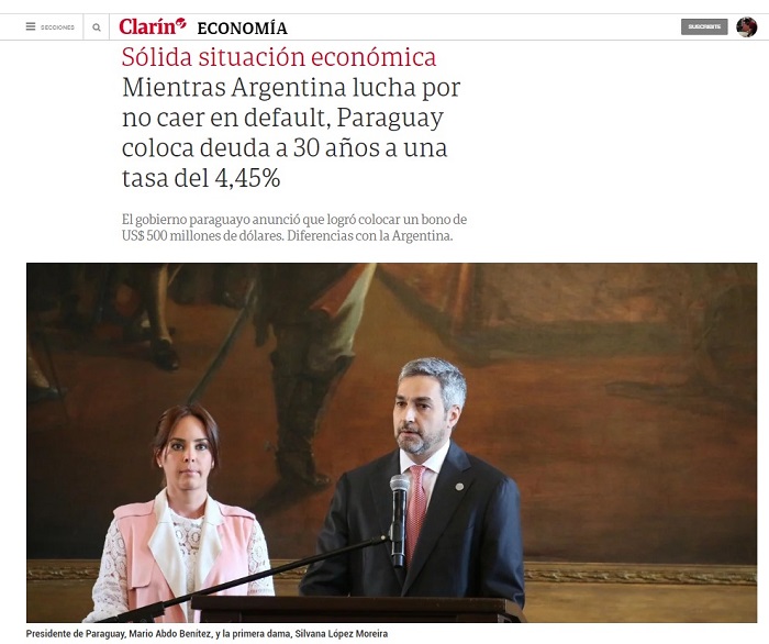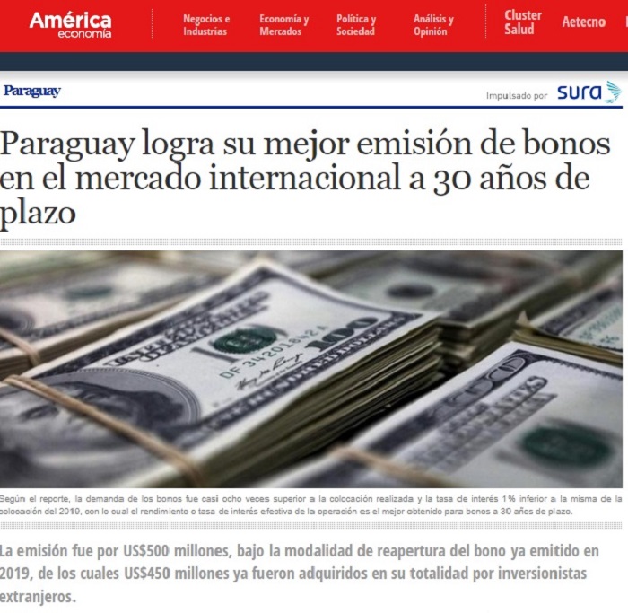 Varios medios internacionales se hicieron eco del logro de Paraguay al colocar los bonos en el mercado internacional por el valor de USD 450 millones a una tasa de interés del 4,45%, a un plazo de 30 años.