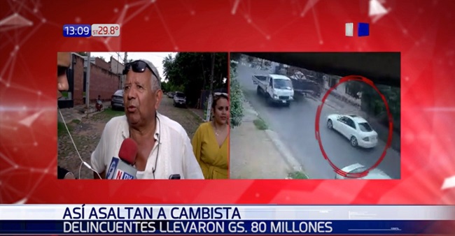 Cerca de G. 80 millones robaron a un cambista en la ciudad de Lambaré sobre las calles Humaitá y San Juan Bautista, el jueves. Un video muestra cómo los asaltantes siguieron al hombre.