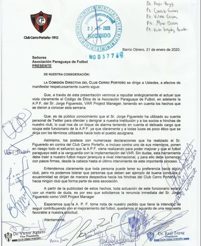 La Comisión Directiva del Club Cerro Porteño solicitó la renuncia inmediata de Jorge Figueredo como VAR Project Manager.