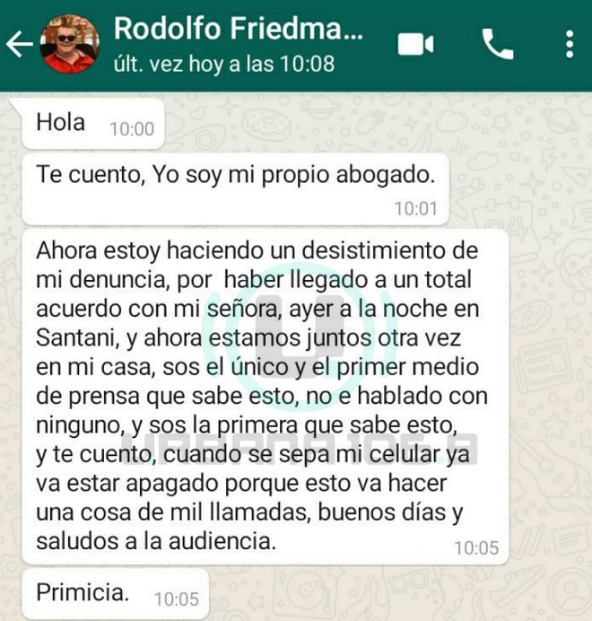 Por su parte, Friedmann envió un mensaje a través de WhatsApp a la producción de una FM capitalina.