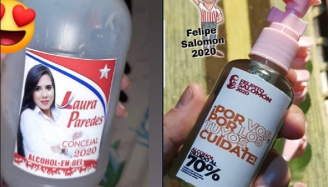 En estos días, en redes sociales se pudo ver imágenes de envases de alcohol en gel con imágenes de candidatos a cargos públicos. Como se sabe, este año hay elecciones municipales para la elección de concejales e intendentes.